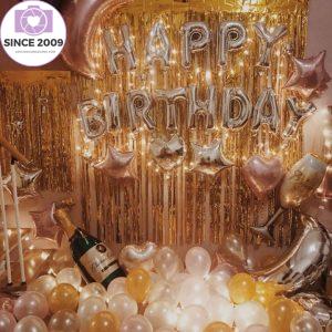Set bóng trang trí sinh nhật Happy birthday +30 bóng nhũ + 4 bóng tim sao+bóng hình ly, chai +2 rèm kim tuyến
